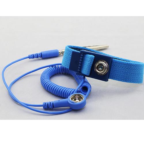 Antistatic wrist wired strap is compose of wristband, coil cord, button / snaps, stud, alligator clip and banana plug.