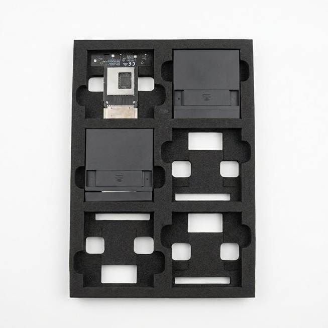 • Clean die-cut performance at high hardness — EVA foam at this hardness level cuts cleanly with sharp, well-defined edges. This was essential for the cavity geometry, which needed to accept the PCB board in one orientation and the housing/assembled module in the same pocket.